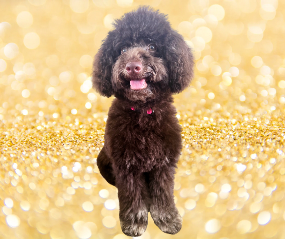 CoCo is a brown, phantom Mini Poodle with stunning green eyes.